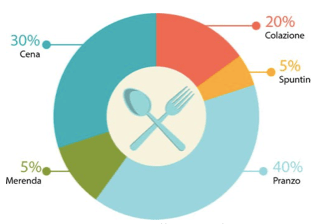 L’energia (intesa come calorie) assunta nella giornata, dovrebbe essere suddivisa come schematicamente rappresentato nella seguente figura: