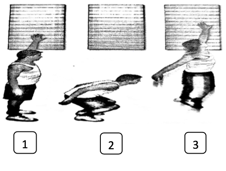 -POSIZIONE DI PARTENZA: il soggetto si pone a fianco alla parete in stazione eretta, talloni a terra e braccia distese lungo i fianchi. Con la mano destra/sinistra sporca di gesso o marcata di acqua tocca la parete lasciando un segno. La misura in cm dell’altezza massima raggiunta sulla parete dal polpastrello del dito medio rappresenta la posizione di partenza. (FIG 1)
